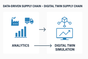 Digital Twin Supply Chains is de volgende ontwikkeling (emerging) van datagestuurde operaties. DTSC integreert realtime monitoring, analyse en simulatie om adaptieve, veerkrachtige en efficiënte toeleveringsketen te creëren. Vooral aanvoerketens met beperkte capaciteit (bunkers, magazijnen) met frequente leveringen, afgestemd op productiecapaciteit (Inbound & Operations Planning & Control = Control Tower) zouden geholpen zijn met DTSC.