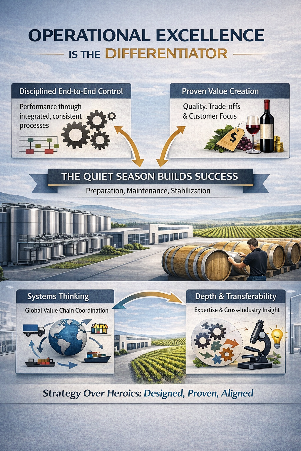 Is the end-to-end wine process your business? Probably not. But the forces that determine success in wine—discipline, timing, quality control, and market insight—are the same forces that shape performance in most industries. FIVE TAKE AWAYS for your business and why Operational Excellence using domain expertise and Crosss-Industry Experience is indeed an excellent start in whatever organisation.